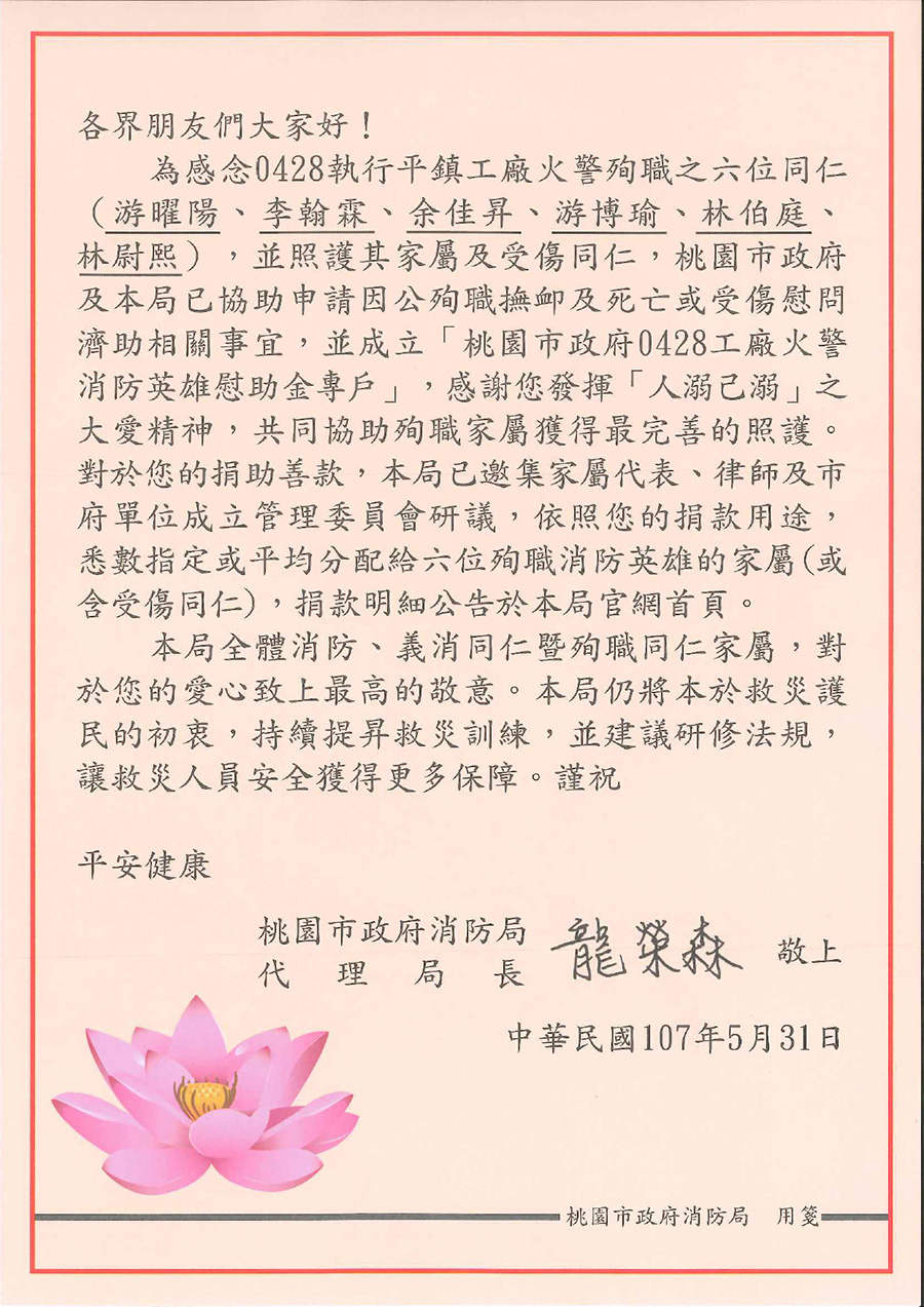 諾瓦材料科技捐助十萬 慰問敬鵬殉職消防員家屬