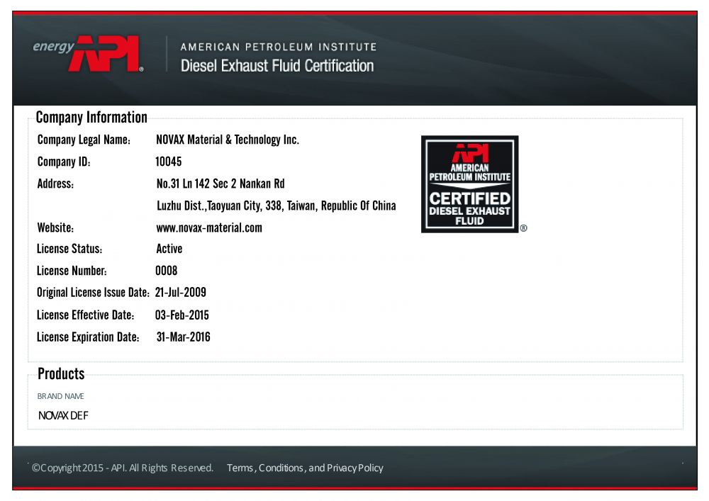 諾瓦材料是美國石油學會唯一台灣會員,我們重視尿素溶液的品質,從2009年起,我們每一年都會進行認證。(更新時間:2015年02月03日)