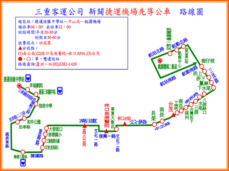 捷運機場線預計明年底通車,新北市交通局為培養路線上的通勤族群,本公司配合增設【捷運機場線先導公車】。起站為蘆洲的捷運徐匯中學站,途經三和國中站、三重站,從三重交流道上中山高,中途下國道停靠林口長庚醫院,再沿中山高到桃園南崁以及台茂購物中心,最後抵達桃園機場第一、第二航廈,單程約60至90分鐘,不失為三蘆地區民眾前往桃園機場經濟實惠的選擇,歡迎民眾多多搭乘!