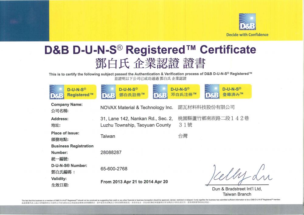 美商鄧白氏(紐約證券交易所代碼:DNB 鄧白氏集團介紹 ),是企業情報和商業資訊服務的全球領導品牌,在公司的發展過程中,重要的任務是為客戶提供商業資訊、分析工具與專業經驗,協助客戶作出信心十足的商業決策. 我們很榮幸的得到美商鄧白氏的認證!