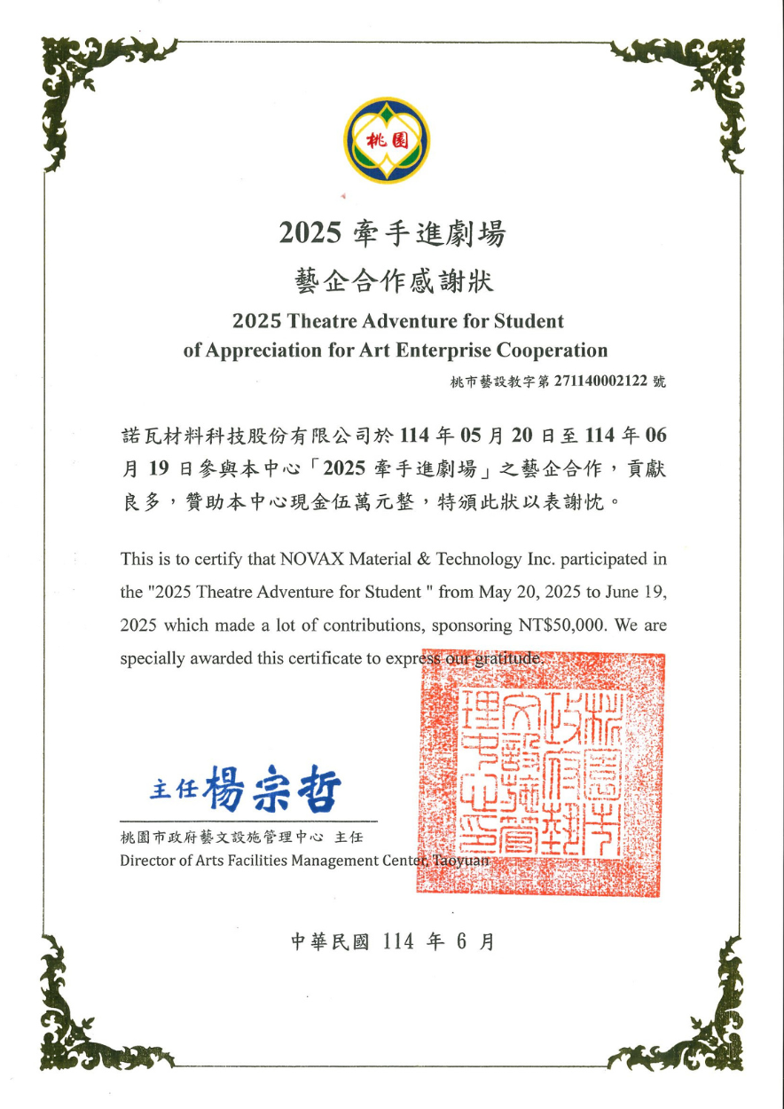 為落實藝術教育向下扎根,諾瓦材料科技熱情響應《2025牽手進劇場》計畫,成為今年贊助夥伴之一,桃園展演中心,為桃園市最具規模的專業藝文場館,也是城市生活的亮點,近年逐步建立以「鐵玫瑰」為品牌識別的系列活動,透過品牌下音樂節、藝術節、藝文學堂、牽手進劇場、青少年劇場培訓計畫...等活動擴大藝文推廣族群,平均每年觸及近百萬名藝文人口。由桃園市政府文化局主辦、鐵玫瑰品牌系列活動之一的《2025牽手進劇場》活動,每年優先邀請桃園偏鄉學童一同走進劇場,拓展藝術視野,感受現場表演的魅力。