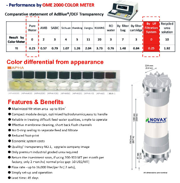NOVAX®超濾技術系統(NOVAX® UF Filtration system),是諾瓦引進德國最新科技過濾技術,可有效除去混濁懸浮物,以及病原體如細菌的超過濾系統,能夠避免產生凡得瓦力所造成的混濁現象。即使尿素來源品質不佳,透過NOVAX® UF Filtration system,仍然可以有效確保產出的AdBlue®清淨度由平均值2.04,提升至0.25,與純水的清澈度相同。